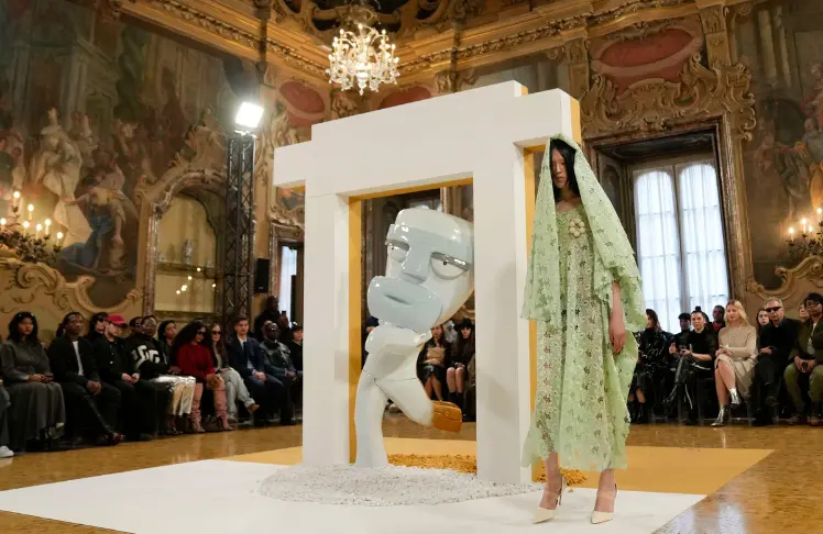 If the mix seems incongruous, then consider the objective achieved. The character forms part of an installation by Lagos-based artist Yusuff Aina, commissioned by designer Iniye Tokyo James for his Fall-Winter 2024 fashion show “Expansion,” held in the space on Saturday. In partnering on the project, the pair sought to challenge the traditional stereotype about the styles of art and fashion that come from their native Nigeria.