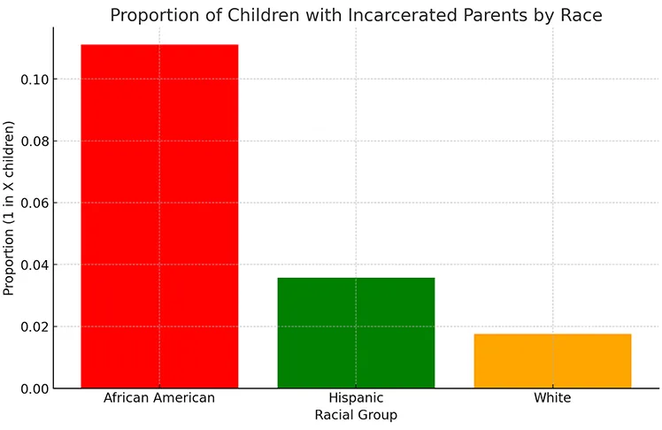Parental loss due to incarceration is common among Black K-12 students nationwide. Recent statistics from the National Education Association and Bureau of Justice found that 1 in 9 Black children in the U.S. have an incarcerated parent, compared to 1 in 57 white children.
