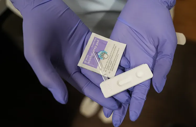 A doctor holds a rapid test for congenital syphilis. According to the Great Plains Tribal Epidemiology Center, 1 in 40 Native American and Alaska Native babies born in the Great Plains region in 2022 had a syphilis infection. (Elizabeth Conley/Houston Chronicle via Getty Images)
