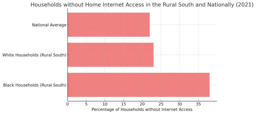 In the rural South, where the digital divide is greatest, about 38% of Black households didn’t have home internet access, which is a higher percentage than White people in the same region (23%) and the national average (22%), according to a 2021 report from the Joint Center for Political and Economic Studies.
