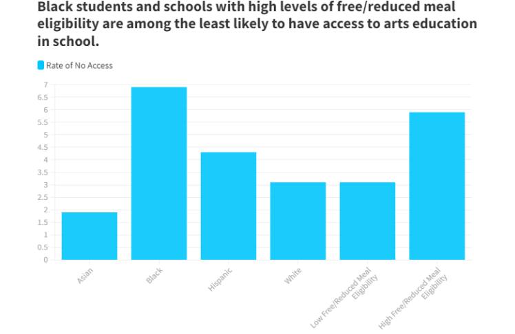 Other than Indigenous students, of whom a quarter lack access to arts education, Black students have the least access, with 7% attending schools that don’t offer any arts education. This is more than twice the rate of white students (3%) and Asian students (2%).