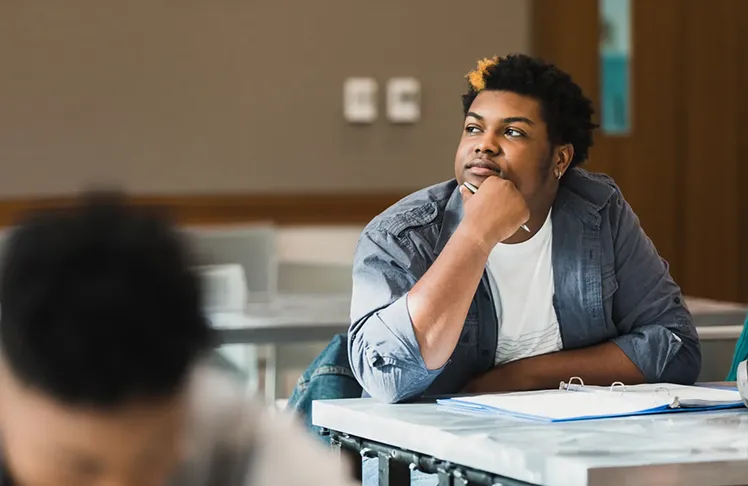 The teenage boy rests his chin on his hand as he looks away and daydreams during class. | Photo Credit: SDI Productions