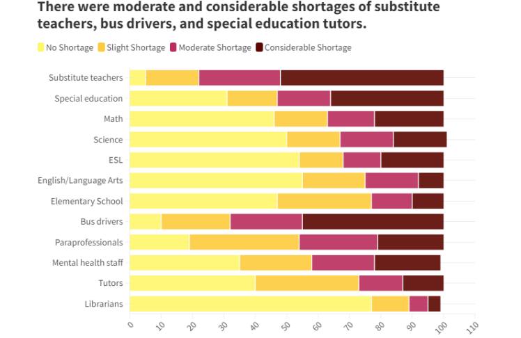 The shortages weren’t limited to classroom teachers. Districts nationwide also reported moderate or considerable shortages of substitute teachers (78%) and special education teachers (53%).