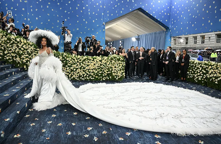 Ross, who last attended the Met Gala back in 2003, arrived at the event Monday adorned in feathers and sporting a jaw-dropping 18-foot-long train. It took five men to carry the star’s hand-embroidered ivory white accessory, which enveloped the carpeted steps when laid flat. But hidden in the yards of fabric was a small detail many may have missed. “It has (stitched) the names of all my children and my eight grandchildren,” Ross told Vogue carpet-side, calling the dress “a forever family gown.”