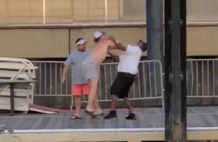 The fight moves down the dock and grows. Videos of the chaos show punches being thrown between the groups and at least one person being knocked into the water.