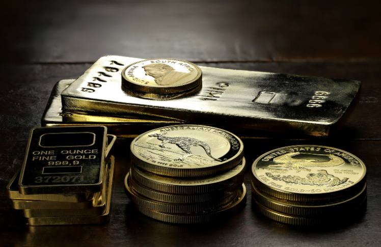 Gold bullion is physical gold of high value, usually in coins or bars. These gold coins and bars are typically available from banks, mints, coin shops, online dealers, and some jewelry stores. Gold coins are easily carried and have a numismatic value, meaning the price may increase based on quality, variety, and demand. Gold bars are convenient for storage but are more expensive than coins. Both can easily pass down to beneficiaries.