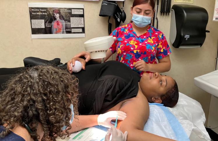 The clinic staff started preparing the exam room, so Vital could get the implant right away. Kramer turned on some calming music on her phone, washed her hands and had Vital lie down and raise her left arm over her head. Physician assistant Andrea Marquez came in to hold Vital’s other hand and offer words of encouragement.