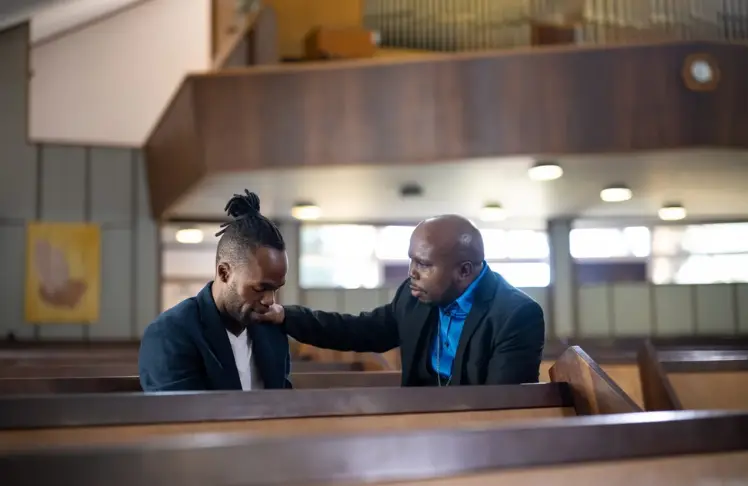 Pastor talks to man sitting in pew in church. Credit: Pixel Catchers/Getty Images