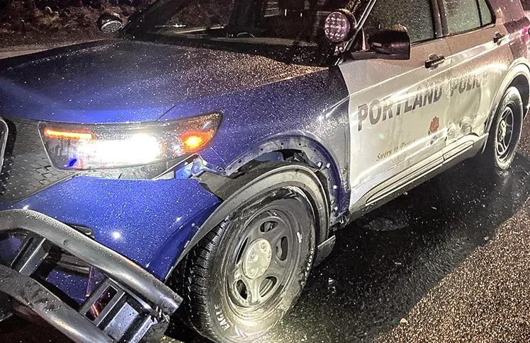 At 9:03 p.m., a driver approached at a high speed and sideswiped the driver’s side of the police vehicle, causing it to lurch forward. Initially, neither officer reported any injuries. The driver who collided with them pulled over to the shoulder and was subsequently interviewed by a member of the Portland Police Traffic Division. Kwesi Djorgee, 59, from Portland, was arrested and charged with Driving Under the Influence of Intoxicants (DUII), Reckless Driving, and Recklessly Endangering Another Person (two counts).