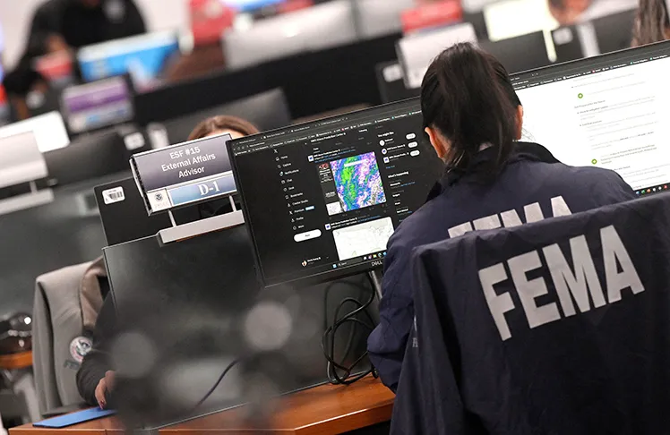 A FEMA employee works at the National Response Coordination Center at the headquarters for the Federal Emergency Management Agency in Washington, DC, in January. (Olivier Douliery/Abaca/Sipa USA/AP/File via CNN Newsource)