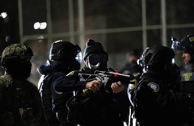 Federal officers in tactical gear deployed tear gas and percussion grenades to try to disperse crowds near the Bishop Henry Whipple Federal Building.