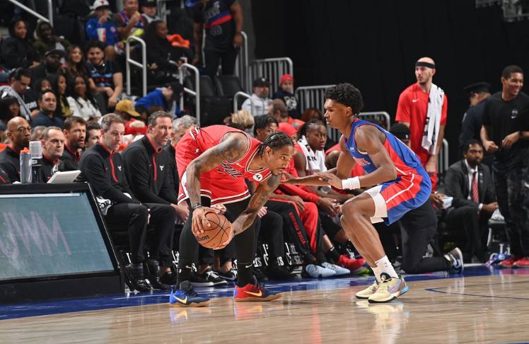 Ausar, shown here guarding Chicago Bulls star DeMar DeRozan, is already taking on some tough defensive assignments. (Chris Schwegler/NBAE/Getty Images)
