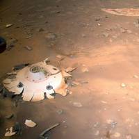 The orange and white parachute can be seen, covered in dust, but the canopy doesn’t show any damage. It was the biggest parachute used on Mars to date, at 70.5 feet (21.5 meters) wide. The team will continue to analyze the images to determine if the parachute experienced any changes over the next several weeks.