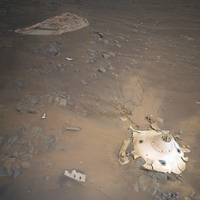 Previously, we’ve only seen images of the discarded landing gear from a rover’s perspective, like an image taken by Perseverance showing the parachute and backshell from a distance. Aerial images, captured for the first time by Ingenuity from 26 feet (8 meters) in the air, provide more detail.
